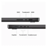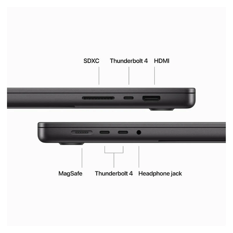 Ports Three Thunderbolt 4 (USB-C) Ports with Support For: Charging, DisplayPort, Thunderbolt 4 (Up to 40Gb/s), USB 4 (Up to 40Gb/s), HDMI Port, SDXC Card Slot, 3.5 mm Headphone Jack, MagSafe 3 Port